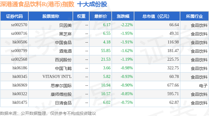 深港通食品饮料R(港币)(483066)指数十大成份股详情如下: