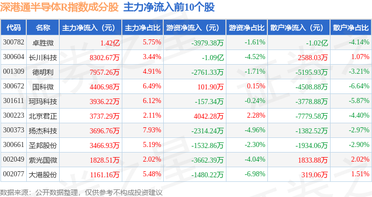 资金流向方面,深港通半导体R(483067)指数成份股当日主力资金净流出合计5.7亿元,游资资金净流出合计1.51亿元,散户资金净流入合计7.21亿元。成份股资金流向详情见下表: