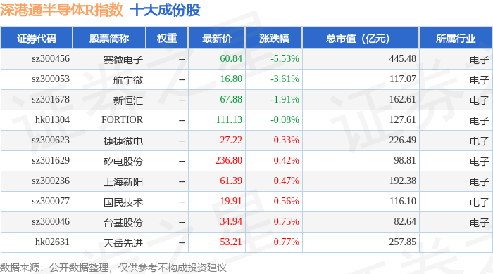证券之星消息,12月17日,深港通半导体R(483067)指数报收于14534.24点,涨1.91%,成交329.95亿元,换手率2.55%。当日该指数成份股中,上涨的有35家,卓胜微以7.3%的涨幅领涨,下跌的有4家,赛微电子以5.53%的跌幅领跌。