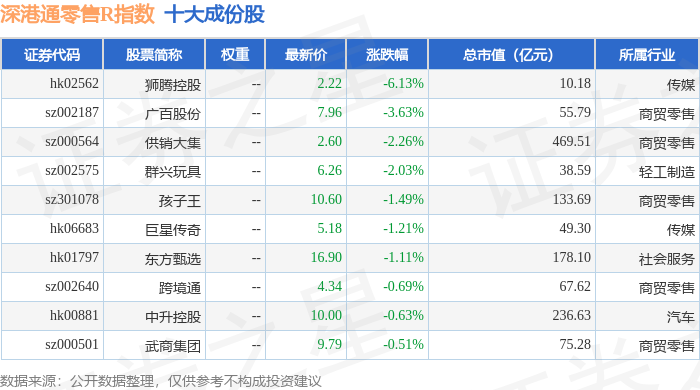 证券之星消息,12月17日,深港通零售R(483073)指数报收于2510.56点,涨0.67%,成交168.48亿元,换手率1.98%。当日该指数成份股中,上涨的有19家,友阿股份以2.53%的涨幅领涨,下跌的有11家,狮腾控股以6.13%的跌幅领跌。