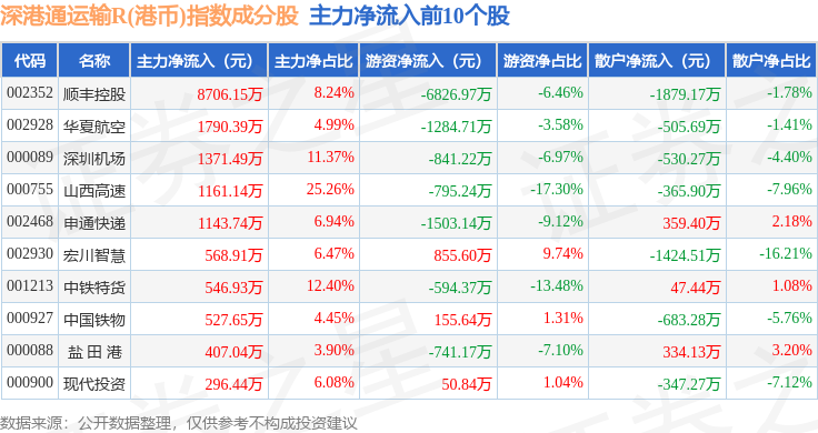 资金流向方面,深港通运输R(港币)(483078)指数成份股当日主力资金净流出合计2.32亿元,游资资金净流出合计9117.91万元,散户资金净流入合计3.23亿元。成份股资金流向详情见下表: