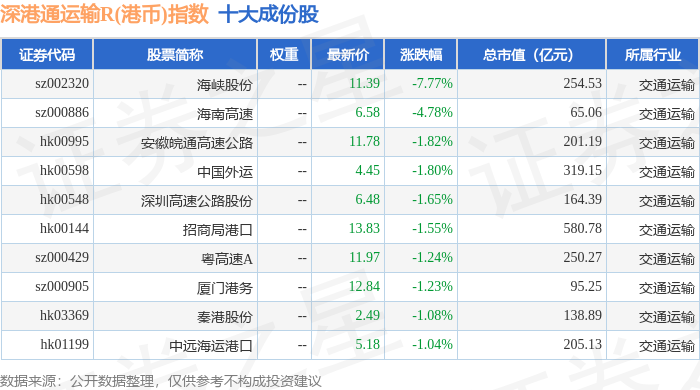 深港通运输R(港币)(483078)指数十大成份股详情如下: