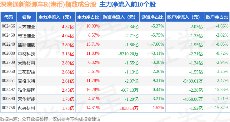 资金流向方面,深港通新能源车R(港币)(483088)指数成份股当日主力资金净流入合计31.1亿元,游资资金净流出合计17.57亿元,散户资金净流出合计13.52亿元。成份股资金流向详情见下表: