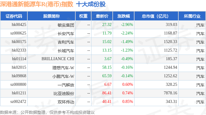 深港通新能源车R(港币)(483088)指数十大成份股详情如下: