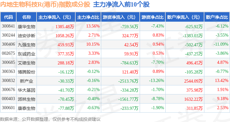 资金流向方面,内地生物科技R(港币)(483102)指数成份股当日主力资金净流出合计2.71亿元,游资资金净流出合计1.09亿元,散户资金净流入合计3.79亿元。成份股资金流向详情见下表: