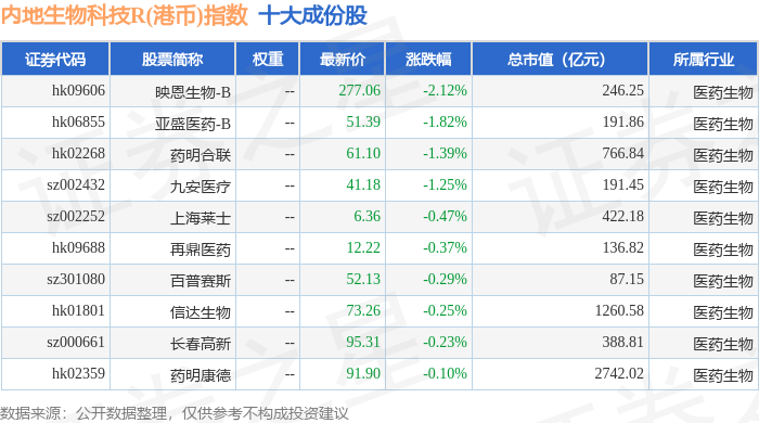 内地生物科技R(港币)(483102)指数十大成份股详情如下:
