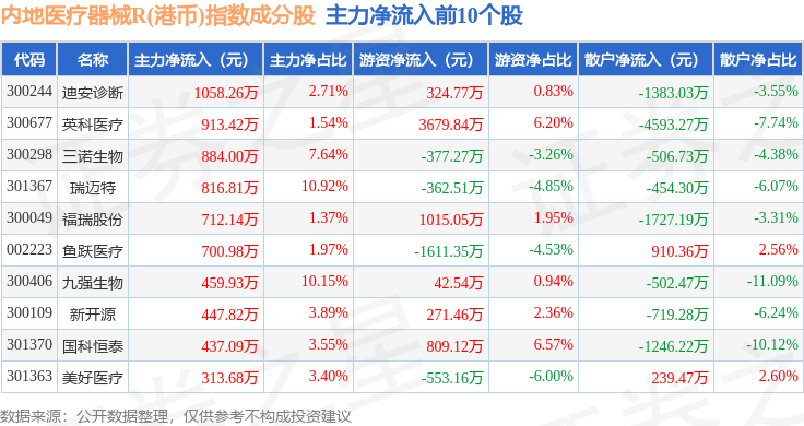 资金流向方面,内地医疗器械R(港币)(483104)指数成份股当日主力资金净流出合计5363.93万元,游资资金净流出合计1154.01万元,散户资金净流入合计6517.94万元。成份股资金流向详情见下表: