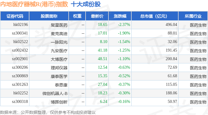 内地医疗器械R(港币)(483104)指数十大成份股详情如下: