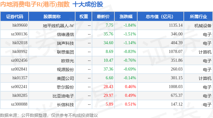 内地消费电子R(港币)(483106)指数十大成份股详情如下: