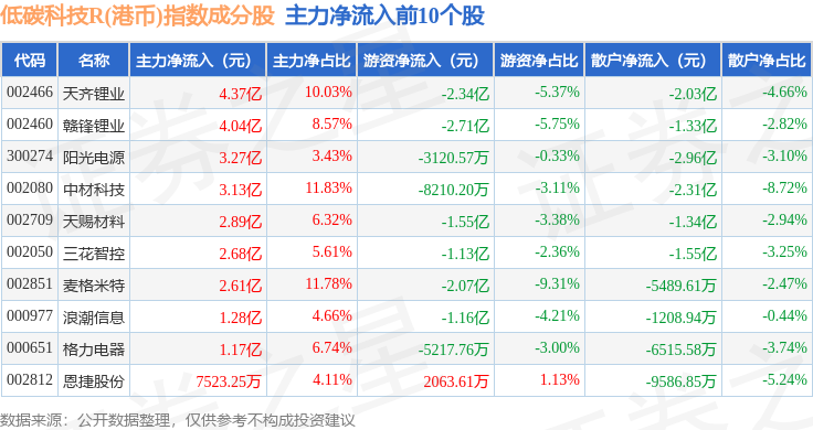 资金流向方面,低碳科技R(港币)(483161)指数成份股当日主力资金净流入合计22.52亿元,游资资金净流出合计14.86亿元,散户资金净流出合计7.65亿元。成份股资金流向详情见下表: