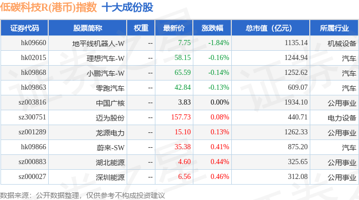 低碳科技R(港币)(483161)指数十大成份股详情如下: