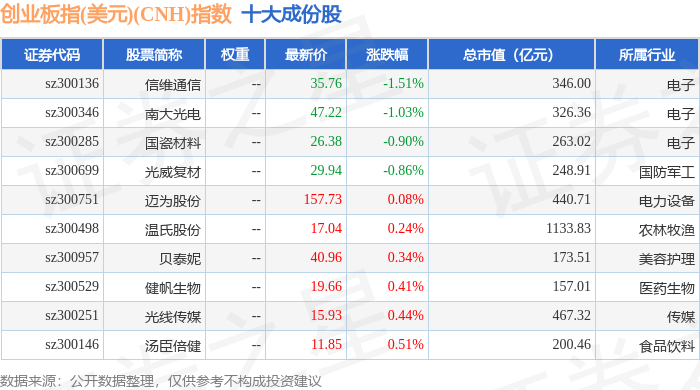 创业板指(美元)(CNH)(970007)指数十大成份股详情如下: