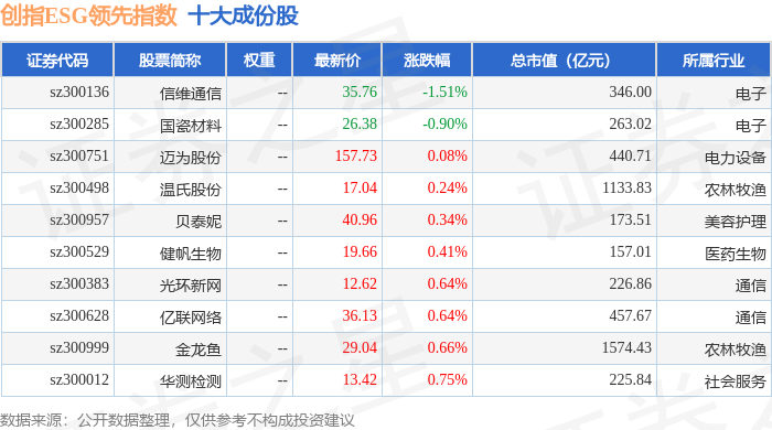 近10日内创指ESG领先(970031)指数成份股做了调整,新纳入了3只股票,剔除了3只股票。