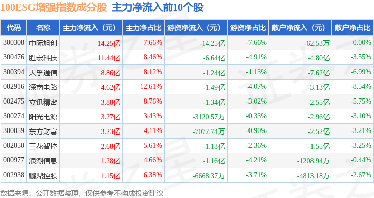 资金流向方面,100ESG增强(970033)指数成份股当日主力资金净流入合计47.18亿元,游资资金净流出合计29.09亿元,散户资金净流出合计18.09亿元。成份股资金流向详情见下表: