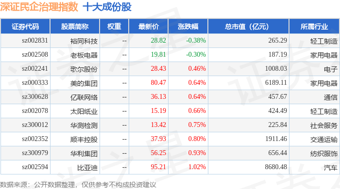 深证民企治理(970058)指数十大成份股详情如下: