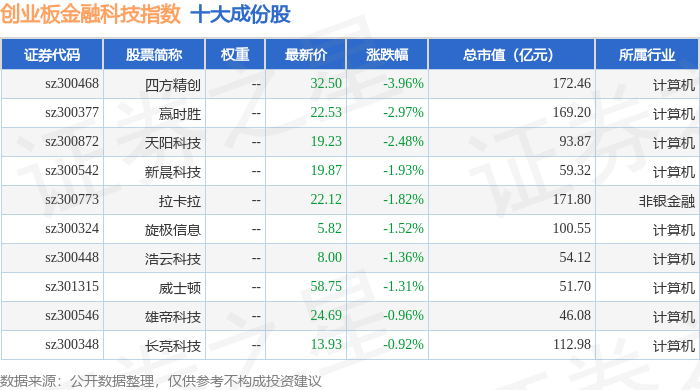 创业板金融科技(970085)指数十大成份股详情如下: