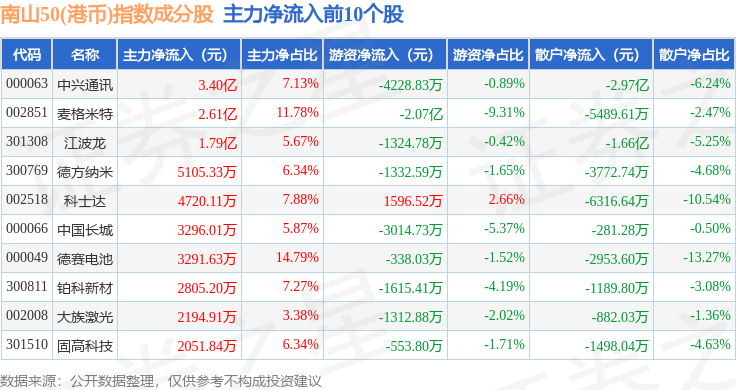 资金流向方面,南山50(港币)(980024)指数成份股当日主力资金净流入合计5.44亿元,游资资金净流出合计4.36亿元,散户资金净流出合计1.08亿元。成份股资金流向详情见下表:
