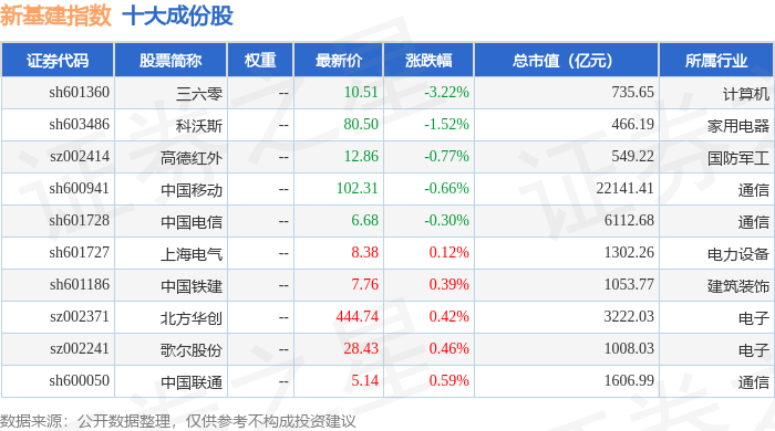 新基建(980029)指数十大成份股详情如下: