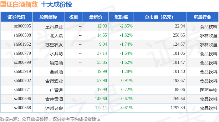 国证白酒(980031)指数十大成份股详情如下: