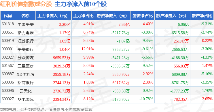 资金流向方面,红利价值(980103)指数成份股当日主力资金净流入合计6.57亿元,游资资金净流出合计5046.55万元,散户资金净流出合计6.07亿元。成份股资金流向详情见下表: