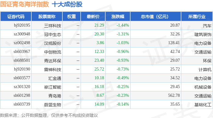 国证青岛海洋(980532)指数十大成份股详情如下: