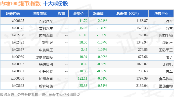 证券之星消息,12月17日,内地100(港币)(983002)指数报收于1897.39点,涨1.66%,成交1852.72亿元,换手率0.53%。当日该指数成份股中,上涨的有79家,盐湖股份以7.83%的涨幅领涨,下跌的有19家,长安汽车以2.24%的跌幅领跌。
