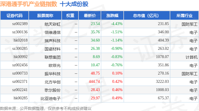 深港通手机产业链(983009)指数十大成份股详情如下: