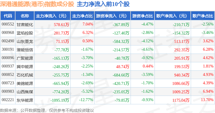 资金流向方面,深港通能源(港币)(983014)指数成份股当日主力资金净流出合计9243.98万元,游资资金净流出合计3386.65万元,散户资金净流入合计1.26亿元。成份股资金流向详情见下表: