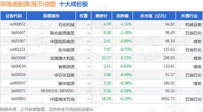 深港通能源(港币)(983014)指数十大成份股详情如下: