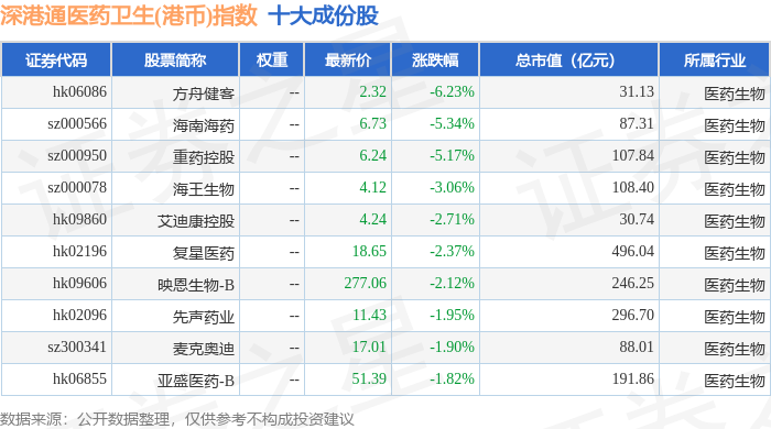 深港通医药卫生(港币)(983024)指数十大成份股详情如下: