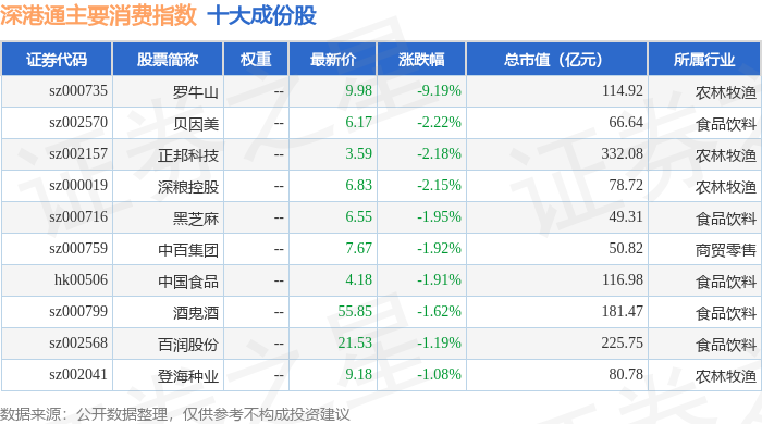 证券之星消息,12月17日,深港通主要消费(983021)指数报收于5662.88点,涨0.47%,成交312.63亿元,换手率1.34%。当日该指数成份股中,上涨的有84家,康耐特光学-一百以5.45%的涨幅领涨,下跌的有28家,罗牛山以9.19%的跌幅领跌。
