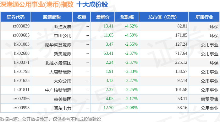 深港通公用事业(港币)(983032)指数十大成份股详情如下: