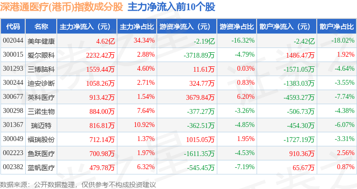 资金流向方面,深港通医疗(港币)(983036)指数成份股当日主力资金净流入合计4.56亿元,游资资金净流出合计2.49亿元,散户资金净流出合计2.07亿元。成份股资金流向详情见下表:
