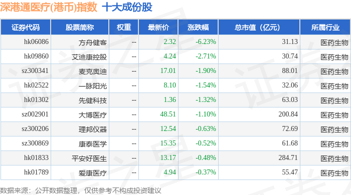 深港通医疗(港币)(983036)指数十大成份股详情如下: