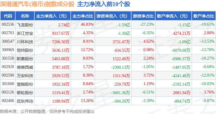 资金流向方面,深港通汽车(港币)(983040)指数成份股当日主力资金净流出合计8.16亿元,游资资金净流出合计2.55亿元,散户资金净流入合计10.71亿元。成份股资金流向详情见下表:
