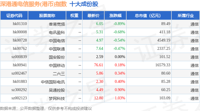 深港通电信服务(港币)(983058)指数十大成份股详情如下: