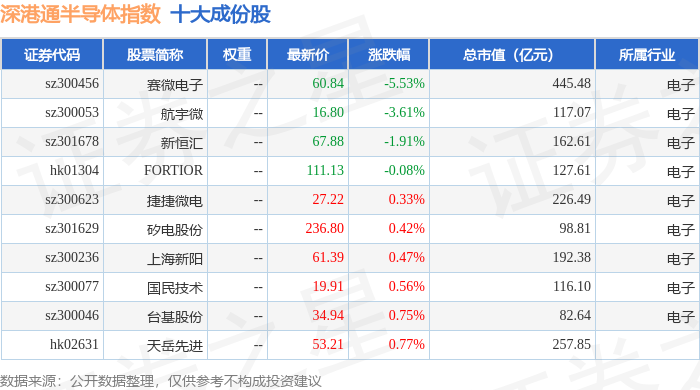 证券之星消息,12月17日,深港通半导体(983067)指数报收于13811.98点,涨1.91%,成交329.95亿元,换手率2.55%。当日该指数成份股中,上涨的有35家,卓胜微以7.3%的涨幅领涨,下跌的有4家,赛微电子以5.53%的跌幅领跌。