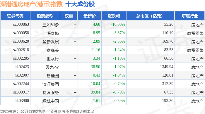 深港通房地产(港币)(983072)指数十大成份股详情如下: