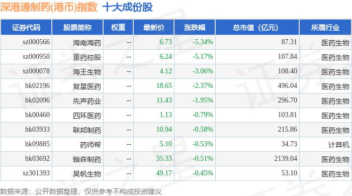 深港通制药(港币)(983080)指数十大成份股详情如下: