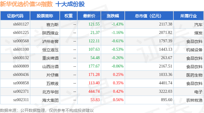 证券之星消息,12月17日,新华优选价值50(989004)指数报收于2170.59点,涨1.78%,成交1662.15亿元,换手率0.97%。当日该指数成份股中,上涨的有44家,新易盛以9.55%的涨幅领涨,下跌的有6家,赛力斯以1.43%的跌幅领跌。