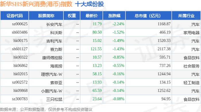 新华SHS新兴消费(港币)(989007)指数十大成份股详情如下: