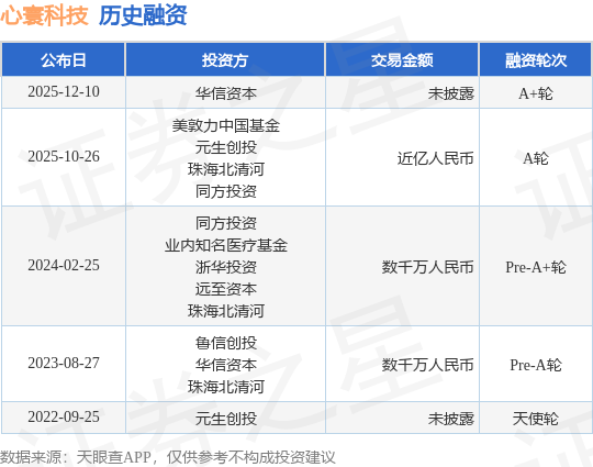 证券之星消息,根据天眼查APP于12月10日公布的信息整理,深圳心寰科技有限公司A+轮融资,融资额未披露,参与投资的机构包括华信资本。