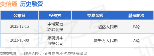 证券之星消息,根据天眼查APP于12月15日公布的信息整理,北京奕信通科技有限公司B轮融资,融资额超亿人民币,参与投资的机构包括中博聚力,亦联创投。