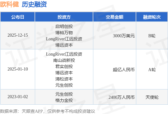 证券之星消息,根据天眼查APP于12月15日公布的信息整理,深圳欧科健生物医药科技有限公司B轮融资,融资额3000万美元,参与投资的机构包括启明创投,博裕万物,LongRiver江远投资,博远资本。