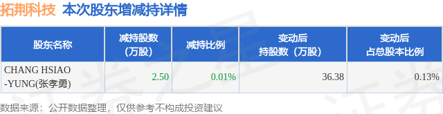 证券之星消息,12月17日拓荆科技发布公告《拓荆科技:股东及董事、高级管理人员集中竞价减持股份结果公告》,其股东CHANG HSIAO-YUNG(张孝勇)于2025年9月22日至2025年9月30日间合计减持2.5万股,占公司目前总股本的0.0089%,变动期间该股股价上涨23.8%,截止9月30日收盘报260.18元。