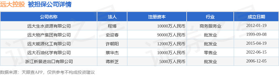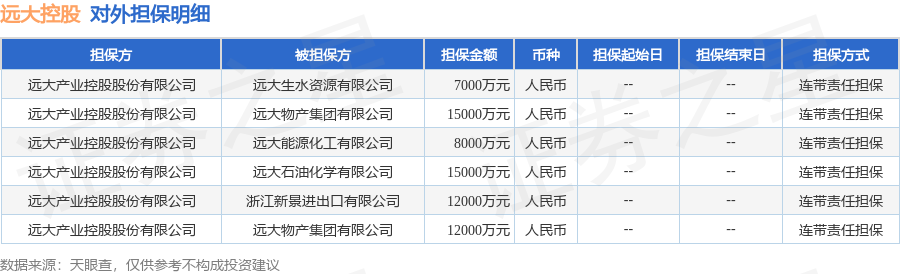 远大控股12月16日披露6笔对外担保,被担保公司5家。对外担保明细如下表: