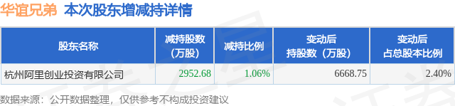 证券之星消息,12月17日华谊兄弟发布公告《华谊兄弟:简式权益变动报告书》,其股东杭州阿里创业投资有限公司于2025年12月17日合计减持2952.68万股,占公司目前总股本的1.0642%,变动期间该股股价上涨0.93%,截止12月17日收盘报2.17元。