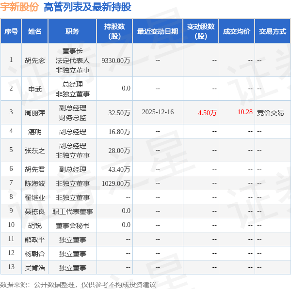 宇新股份近半年内的董监高及核心技术人员增减持详情如下: