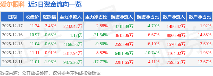 证券之星消息,截至2025年12月17日收盘,爱尔眼科(300015)报收于11.24元,上涨2.46%,换手率0.87%,成交量69.6万手,成交额7.76亿元。