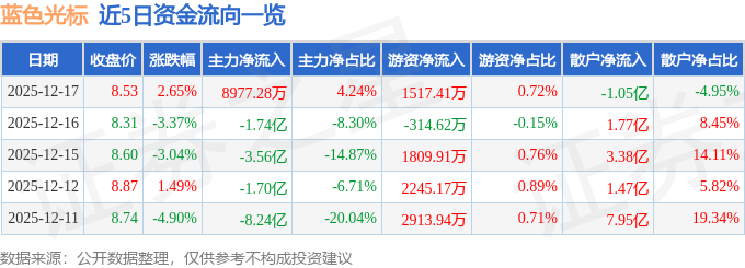 证券之星消息,截至2025年12月17日收盘,蓝色光标(300058)报收于8.53元,上涨2.65%,换手率7.23%,成交量251.52万手,成交额21.18亿元。